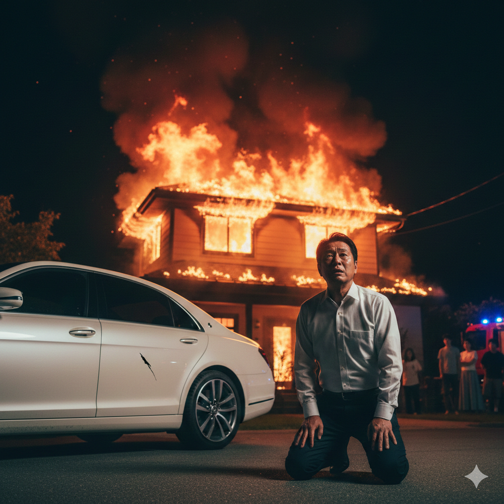 炎の熱が、肌を焦がす。悟は、燃え盛る自宅を見上げながら、その火の中に、自分が一生をかけて積み上げてきた全てが崩れていく音を聞いた。