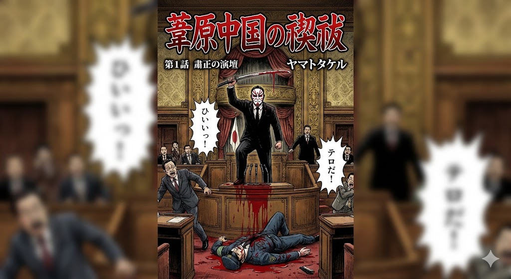 どこから現れたのか、誰も見ていない。まるで最初からそこの空気に溶け込んでいたかのように、男は堂々とそこに在った。 仕立ての良い漆黒のスーツ。顔には、白地に赤の紋様が走る不気味な覆面。そしてその手には、現代の政治の場にはあまりにも不似合いな、抜き身の日本刀が握られていた。